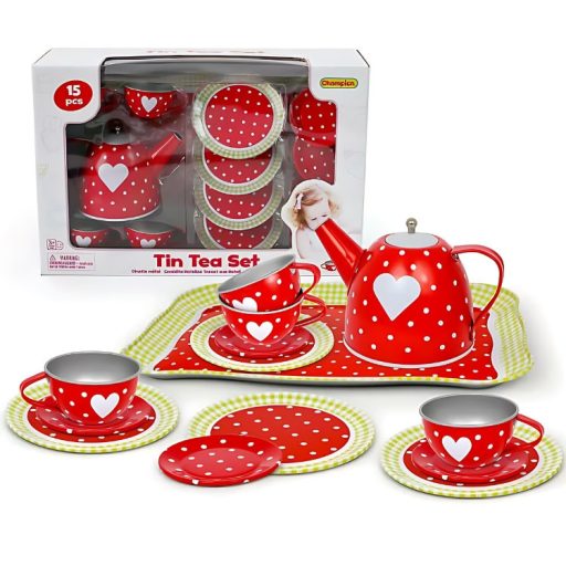 15 darabból álló szívecskés teáskészlet fémből. Remek kiegészítője lehet a játékkonyháknak ez a teázós garnitúra. Különböző szerepjátékokhoz tökéletes kellék, mint például teazsúrok szervezése. A készlet tartalmaz: csészét tányérral, kancsót és tálcát. Játék közben fejlődik a gyermekek kézügyessége, a szociális készsége, bővül a szókincsük, megtanulják a különböző részfolyamatokat és a sorrendiség fontosságát. Anyaga: fém Tálca mérete: 24,5 x 1,5 x 6,5 Kistányér átmérője: 6 cm Nagytányér átmérője: 9 cm Csésze átmérője: 5 cm Kanna mérete: 11,5 x 8,5 x 8,5