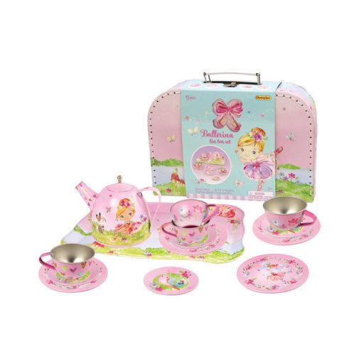 15 darabból álló rózsaszín, balerinás fém teáskészlet bőröndben.Ez a garnitúra remek kiegészítője lehet a játékkonyhának. Különböző szerepjátékokhoz tökéletes kellék, mint például teazsúrok szervezése. Játék közben fejlődik a gyermekek kézügyessége, a szociális készsége, bővül a szókincsük, megtanulják a különböző részfolyamatokat és a sorrendiség fontosságát.