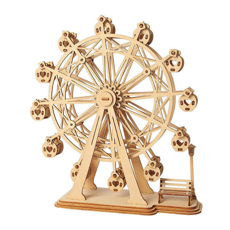 A 3D fa modell óriás kerék megépítése során felelevenedik, milyen jó is óriás keréken lenni. Az élményt csak erősíti, hogy most a saját 3D óriás kerek modellünket építhetjük meg a 120 darab lézervágott fa elemből álló csomagból. A modell összerakása kicsiknek, de akár felnőtteknek is remek szórakozást, kellemes kikapcsolódást nyújt, az eredmény pedig magáért beszél! Az óriás kerék forog, illetve a kis fülkék is mozognak. További 3D fa modellek a Fakopáncs Játék Webáruházban
