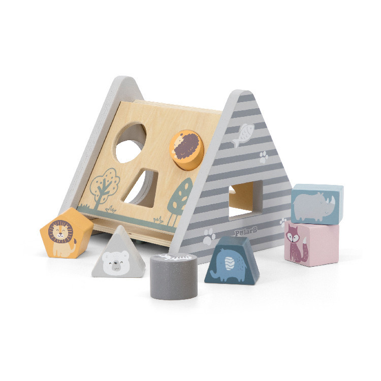 Fából készült natúr- pasztell színű formakereső doboz színes formákkal. A doboz tartalma 7 darab különböző színű és alakú mértani forma, melyeket a megfelelő helyre kell bedobni. A háromszög két oldalán formabedobó, a harmadik oldalán fogaskerekek találhatóak. Ezzel a remek játékkal fejlődik a gyermek finommotoros készsége és formafelismerő képessége. Ezeken felül segít a színek és formák megnevezésének elsajátításában.