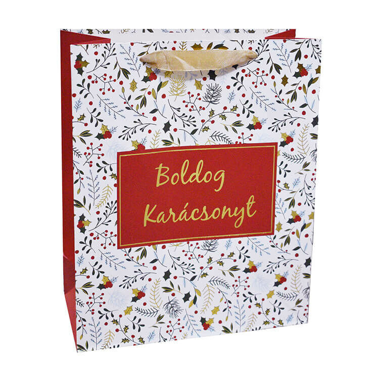 Karácsonyi témájú ajándéktasak bármi meglepetésnek, melynek mérete nem nagyobb, mint 23X18X10 cm. Tasak alapszíne: fehér Zöld és arany levelek, faágak piros terméssel, illetve egy karácsonyi üdvözlőkártyával.