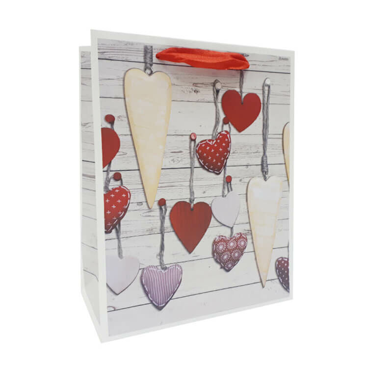 Ajándéktasak - közepes (deszkán bézs, szürke, piros szívek)