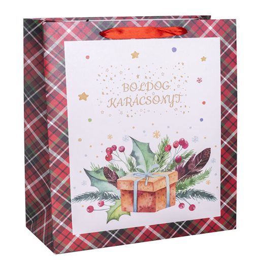 Ajándéktasak - közepes (fehér alapon Boldog Karácsonyt-ajándékkal)