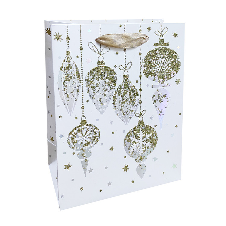 Ajándéktasak - közepes (fehér alapon ezüst karácsonyi díszek arany csillámpor díszítéssel)