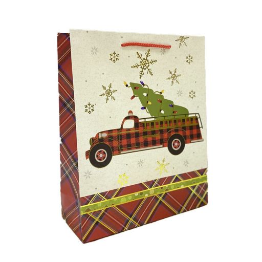 Ajándéktasak - közepes (kockás tűzoltóautó karácsonyfával)