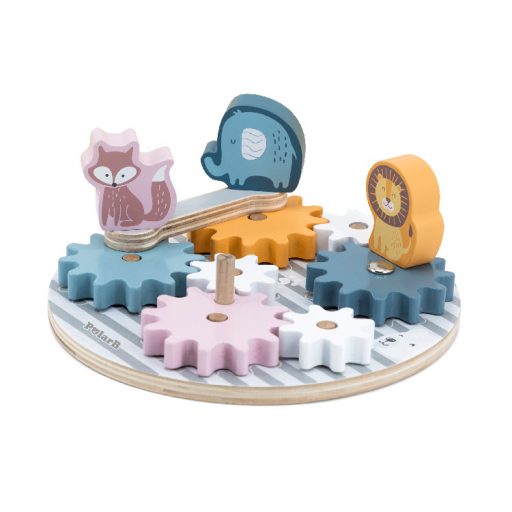 Fából készült színes erdei állatok fogaskerekeken. A játék a mindenki által ismert fogaskerekeken alapszik, melyekre felhelyezhetőek az aranyos állatok. Fejleszti a gyermekek finommotorikus készségét és szem-kéz koordinációját. Segít a problémamegoldó készség és az összefüggések felismerésének fejlődésében. Ezeken felül ismereteti és gyakoroltatja az állatok és színek elnevezéseit.