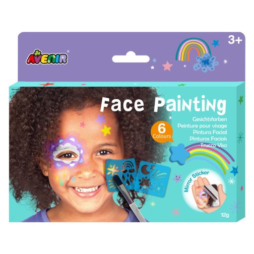 Az Avenir új arcfestő készletei 6 gyönyörű arcfesték színt, valamint 2 újrafelhasználható stencil sablont, egy ecsetet és egy tükörmatricát tartalmaznak.