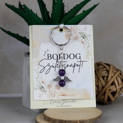 8 mm-es ametiszt ásványból készült angyalka kulcstartó.