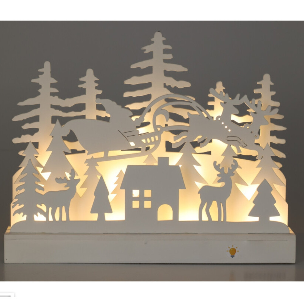Asztaldísz, fenyves LED világítással (szarvas, mikulás szán)