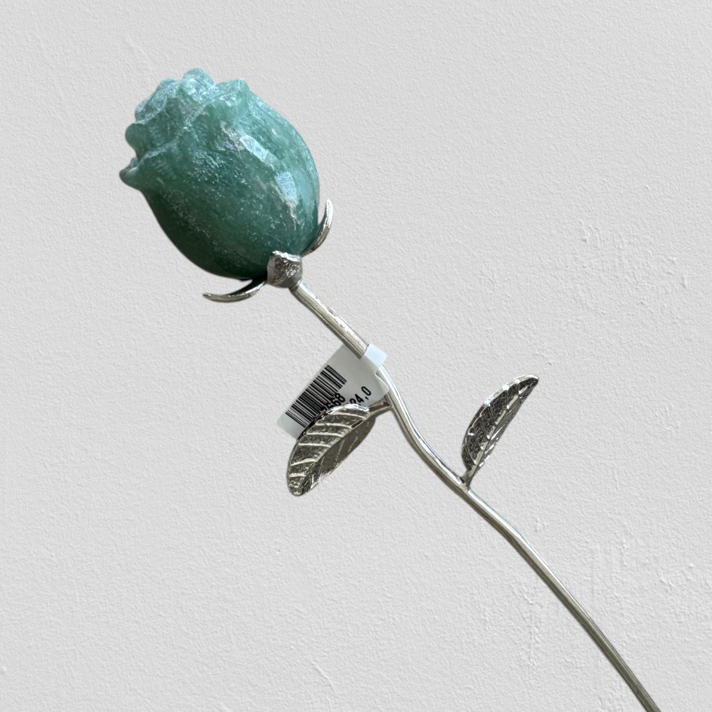 Egy rózsa, amely a természet zöld nyugalmát és a szerencse szelíd erejét hordozza magában. Ez a 16 cm magas kézműves ásványrózsa zöld aventurinból készült, melyet a remény, az optimizmus és a megújulás kövének tartanak.
