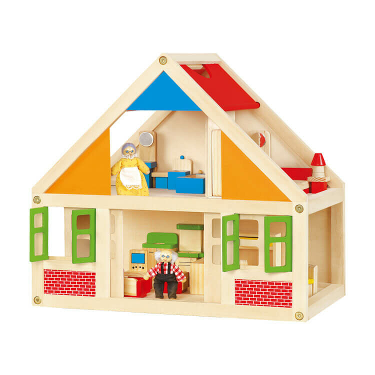 Fából készült babaház (kicsi). A csomag tartalmazza a szobák bútorait és a 2 db babát. Kiválóan alkalmas szerepjátékokhoz, mely segítségével fejlődik a képzelőerő, a nyelvi- és kapcsolatteremtő képesség.