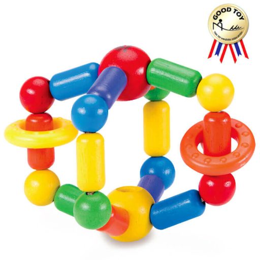 Fából készült bébicsörgő. A játék gumira fűzött színes faelemekből áll, így könnyen kézbe vehető. Két oldalán 1-1 műanyag karika található, ami rágókának is kiválóan alkalmas. Játék közben fejlődik a finommotoros készség és szem-kéz koordináció.
