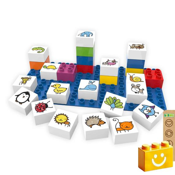 Az állatok az építőelemekre vannak nyomtatva