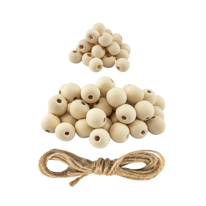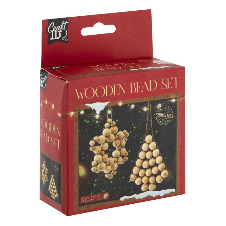 A csomag 65 db fa gyöngyöt tartalmaz egy karácsonyfa és egy hópehely alakú dísz elkészítéséhez.