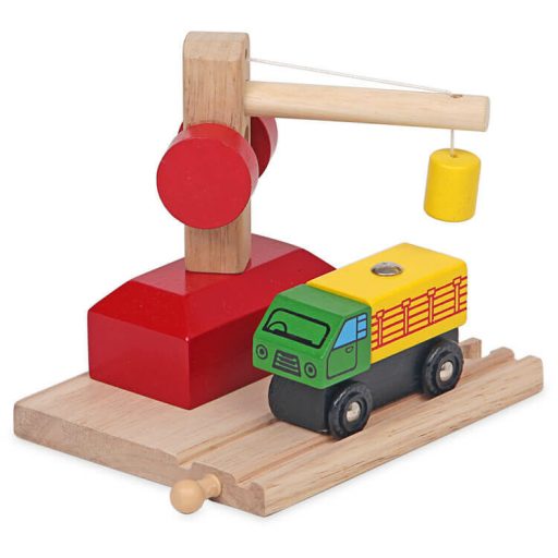 Fából készült daru teherautóval. Remek kiegészítője lehet bármely vonatkészletnek vagy pályának. Használatával még izgalmasabb lesz a játékvonatokkal, autókkal töltött idő.