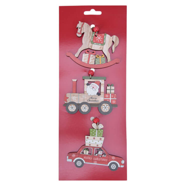 Dekorációs figura (hintaló, mozdony, piros autó ajándékokkal)