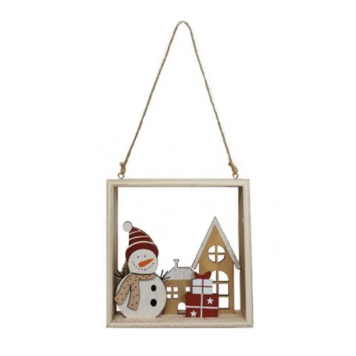 Dekorációs figura keretben (hóember piros sapkával, házikókkal és ajándékokkal)