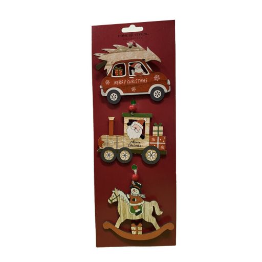 Dekorációs figura (piros autó fenyővel, mozdony, hintaló)