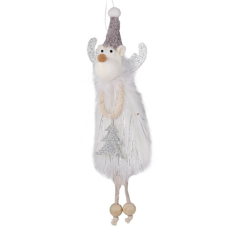 Plüssből és textilből készült dekorációs figura-fehér szőrme ruhában rénszarvas ezüst fenyővel. Ideális belső terek karácsonyi díszítéséhez.