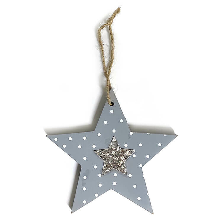 Dekorációs figura (szürke csillag, fehér pöttyökkel, ezüst csillámos csillaggal középen)