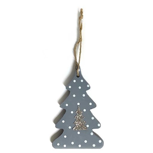 Dekorációs figura (szürke fenyőfa, fehér pöttyökkel, ezüst csillámos fenyőfával középen)