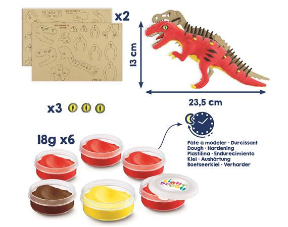 Építsd meg, formáld meg és keltsd életre a T-Rexet! A készlet tartalma: - számozott, fából készült 3D puzzle (QR kódos oktató anyag) - 6 db modellező gyurma (4 piros, 1 barna, 1 sárga) - 3 db 3D szem matrica Fejleszti a gyermek kézügyességét és a finommotorikus készségeit. Száradás után (4 óra) egy szilárd figura lesz a gyermek mindennapi játszótársa. Kész figura mérete: 13x23,5 cm Ajánlott kor (év): 6+ Gyártó/első EU forgalmazó elérhetősége: MAPED SAS 530 route de Pringy - 74370 Argonay sophie.souillard@maped.fr www.maped.com