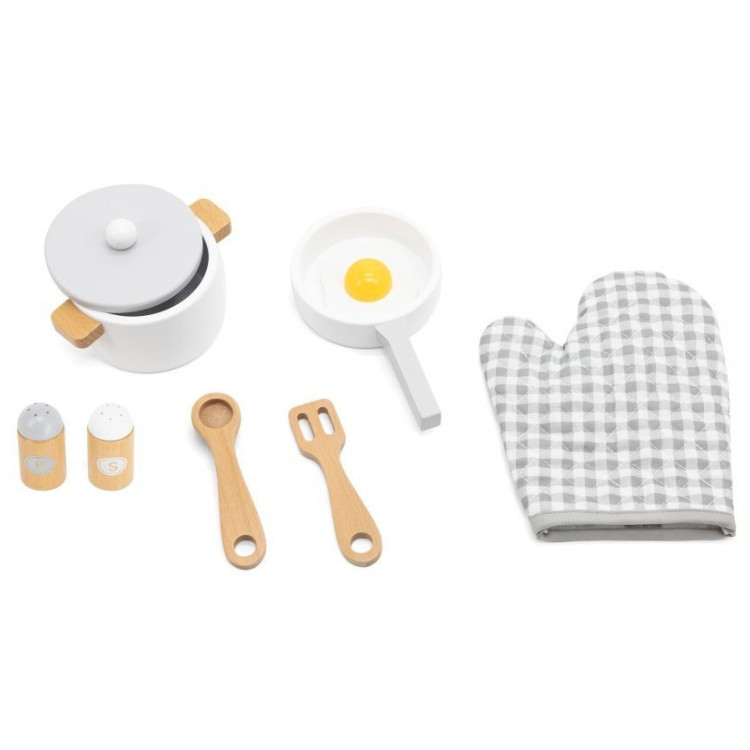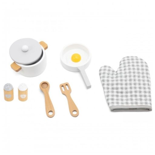 A Viga főzőkészlet egy nagyszerű konyhai készlet gyerekeknek, melynek köszönhetően szórakoztató ételeket készíthet családja és barátai számára. A játék ösztönzi a képzeletet, a kreatív játékot és a szem-kéz koordinációt. A készlet tartalmaz egy fedős edényt, egy serpenyőt tojással, 2 fűszertartót, egy spatulát, egy kanalat és egy sütőkesztyűt.