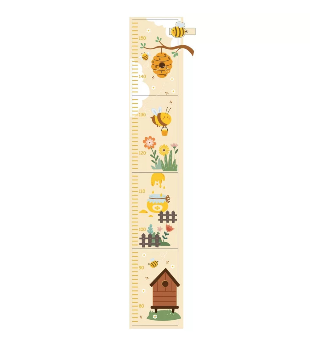 Fából készült mérőléc (magasságmérő) méhecskékkell díszítve. Könnyen falra akasztható, remek dísze lehet a gyerekszobának. Alkalmas 80-150 cm közötti gyermekek magasságának megmérésére. A mérőlécen található méhecskés motívumok garantáltan vidám hangulatot varázsolnak.