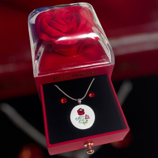 Nemesacélból készül nagyon szép ékszer szett piros dobozban. A doboz tetején piros szappanrózsa