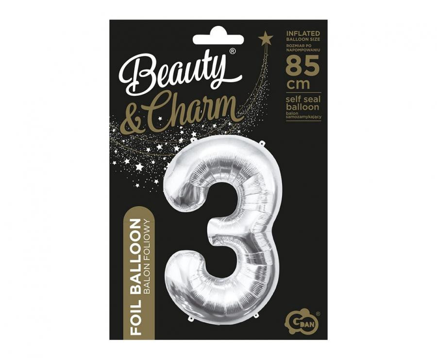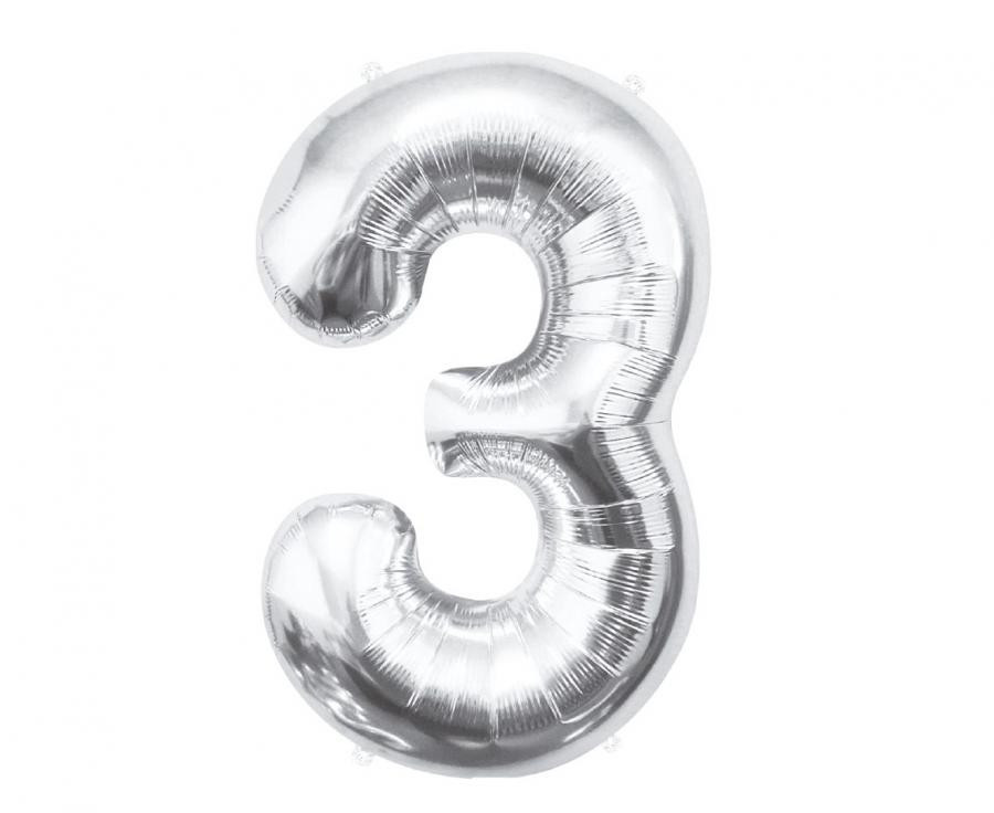 Silver, Ezüst 3-as szám fólia lufi 85 cm