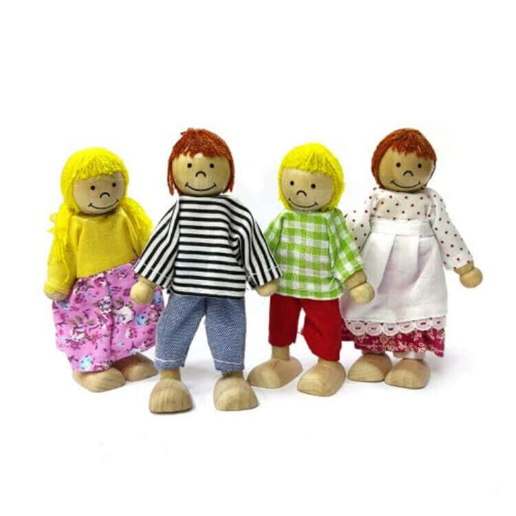 Fedezze fel modern és izgalmas játékainkat, vásárolja meg termékünket kényelmesen webáruházunkból! 4 tagból álló színes, fa babacsalád. A szerepjátékok segítségével fejlődik a képzelőerő, a nyelvi- és kapcsolatteremtő képesség, valamint oldja a feszültséget. A babák keze és lába hajlítható! Csomagolási méret:14x17x4cm Tartalom:4db Magasság:11,5cm