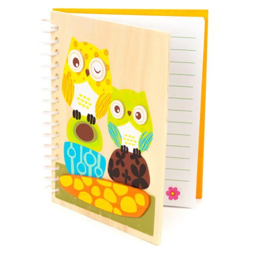 Notesz, fából készült fedőlappal és baglyokkal díszítve. A jegyzetfüzet spirálozott és vonalas lapokat tartalmaz. Alkalmas kisebb feljegyzések írásához.