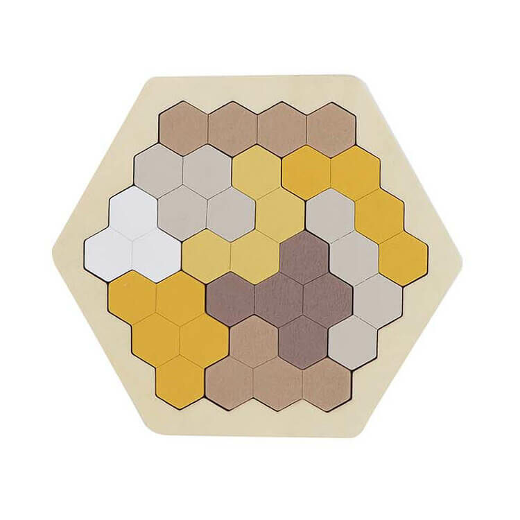 Fából készült Fa tetrisz játék (hatszög, barna). Remek logikai és fejlesztő játék nemcsak gyermekeknek. A játék lényege, hogy az elemeket visszahelyezzük a fa keretbe, anélkül, hogy üres hely maradjon. A játék segítségével fejlődik a gyermek térlátása és kreativitása.