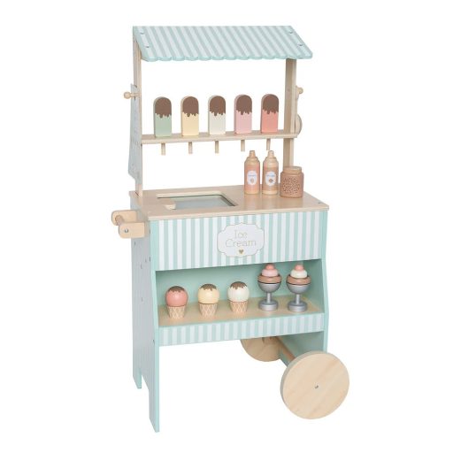 Íme a tökéletes fagylaltos stand a nagy álmokkal rendelkező kisvállalkozóknak! Ez a bájos fagylaltos kocsi klasszikus kék-fehér csíkos kivitelben órákig tartó fantáziadús játékra invitál. Itt a gyerekek finom fagylaltokat szolgálhatnak fel mindenféle ízben - pálcikán és tölcsérben egyaránt! A fagylaltos kocsi egy kis fagyasztórésszel, fagylaltkanalakkal és feltéteket tartalmazó üvegekkel van felszerelve, amelyekkel minden egyes vásárló számára tökéletes fagylaltot lehet készíteni. A nagy kerekeknek köszönhetően pedig a kis fagylaltárus könnyedén tudja mozgatni a kocsit, bárhol is legyenek a vásárlók, legyen az a strandon, a parkban vagy otthon a nappaliban. Tökéletes minden olyan gyermek számára, aki szeret boltosat játszani, és szeretne egy saját fagylaltozót!