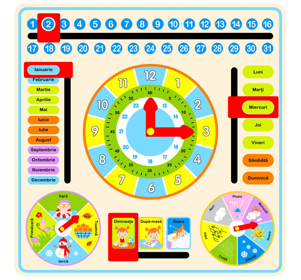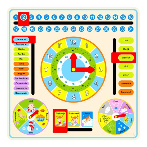 Román nyelvet tudó és tanulni vágyók számára nagyszerű és minőségi oktatási eszköz, mellyel lehetőség adódik az évszakok, hónapok, napok, napszakok, időjárás és az óra szemléletes tanulására illetve oktatására. Csoportos oktatásra(óvoda, iskola) kitűnően hasznosítható, de alkalmas otthoni egyéni fejlesztésre is. Egy évet 12 hónapra bont a naptár, utána megtanítja a négy évszakot, és a hét napjait( Hétfőtől-Vasárnapig). Bemutatja a fontosabb napszakokat szemléltetve a főbb tevékenységekkel. Lehetséges időjárás változásokra is megtanítja a gyermeket. A hónap napjait könnyen be lehet jelölni a mutató segítségével. Az óra és perc elsajátításában látványos faóra áll rendelkezésre. A termék színvilága hagyományos négy alapszínre épül. A naptár akár falra is szerelhető két csavar segítségével.