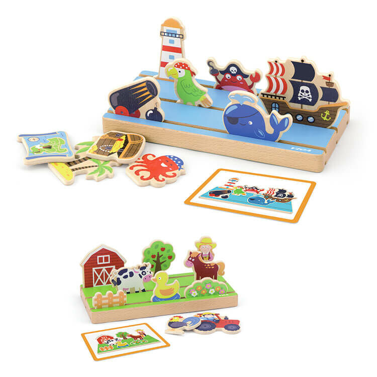 Farm és kalóz építőjáték képekkel. Fából készült fejlesztő játék színes faelemekkel. Ez a játékkészlet két helyszínt jelenít meg: a farmot és az óceánt. Talpazata megfordítható, az egyik oldala zöld színű, a másik pedig kék. A különböző faelemeken felül tartalmaz még 5 darab kétoldalas kártyát, melyen a feladatok találhatóak. Remekül fejleszti a kisgyermekeket számos területen: kreativitás, kézügyesség, koncentrációs képesség. A nagyszerű szórakozás során gyakorolhatják a különböző szerepjátékokat, amelyek szintén pozitív hatással bírnak a fejlődésükben. Ezeken kívül bővül a szókincsük, gyarapszik a tudásuk, megismerkednek a párhuzamosság, mögötte, előtte, mellette fogalmak jelentésével és használatával.