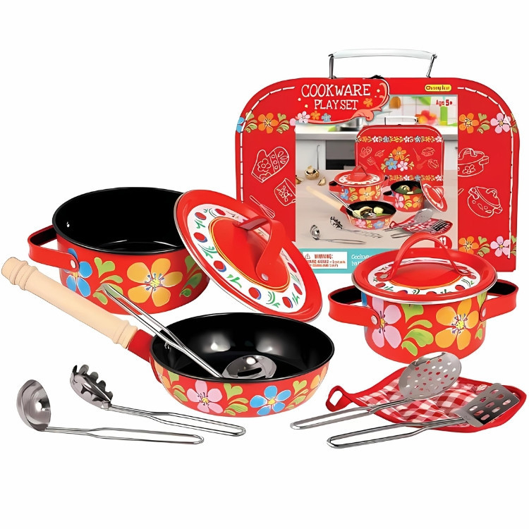 11 darabból álló fém edénykészlet, bőröndben, virágmintával. Ez a garnitúra remek kiegészítője lehet a játékkonyhának. Különböző szerepjátékokhoz tökéletes kellék. Játék közben fejlődik a gyermekek kézügyessége, a szociális készsége, bővül a szókincsük, megtanulják a különböző részfolyamatokat és a sorrendiség fontosságát.