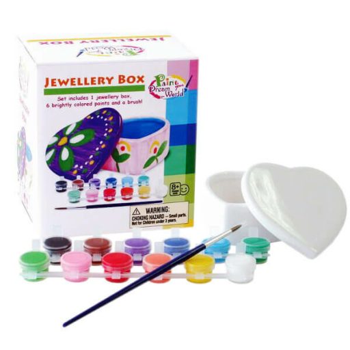 Fesd meg saját, egyedi ékszerdobozodat! A csomag tartalma: 1 db szív alakú ékszerdoboz fedővel, 1 db ecset, 12 színű speciális festék. Hogyan dolgozz? Langyos vízzel tisztítsd meg az ékszerdobozt, majd használd a festéket és az ecsetet a festéshez. Hagyd száradni 24 órán keresztül. 24 óra elteltével, tedd be elektromos, vagy gáz sütőbe. Figyelem! A mikrohullámú sütő nem megfelelő! Égesd a kifestett ékszerdoboz 150 °C-on 25 percig. Óvatosan vedd ki a sütőből, miután kihűlt.