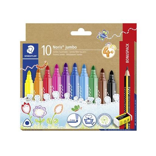 Filctoll készlet, grafitceruzával, radírral, 3 mm, háromszögletű, STAEDTLER "Noris® jumbo 328", 10+1 különböző szín