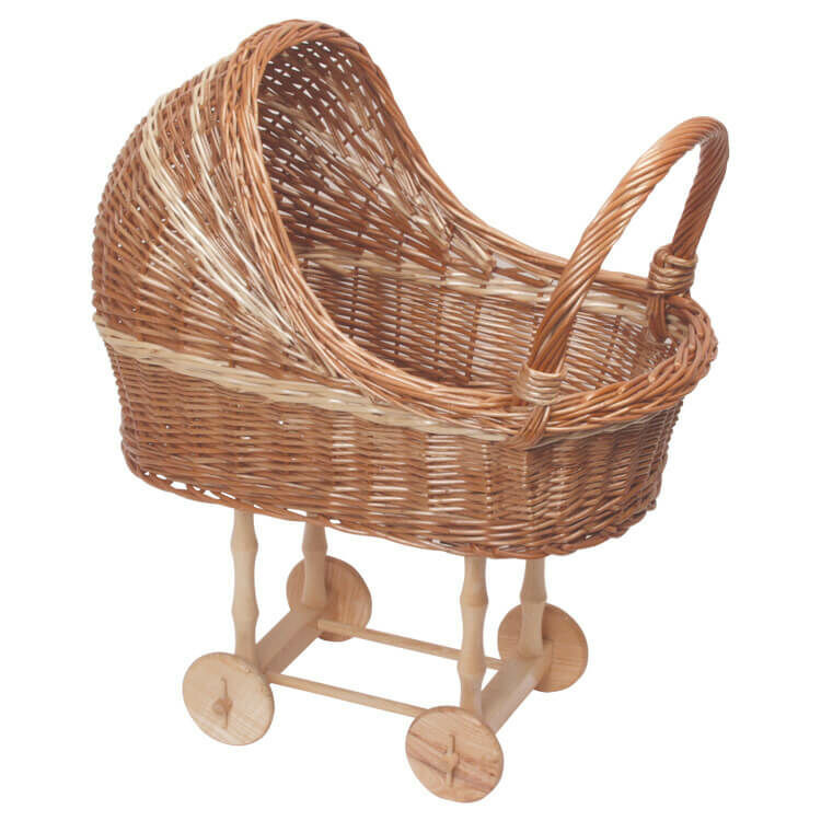 Vesszőből készült fonott babakocsi, fa vázzal. Játékbabáknak tökéletes választás. Kiválóan alkalmas szerepjátékokhoz, mely segítségével fejlődik a képzelőerő, a nyelvi- és kapcsolatteremtő képesség.