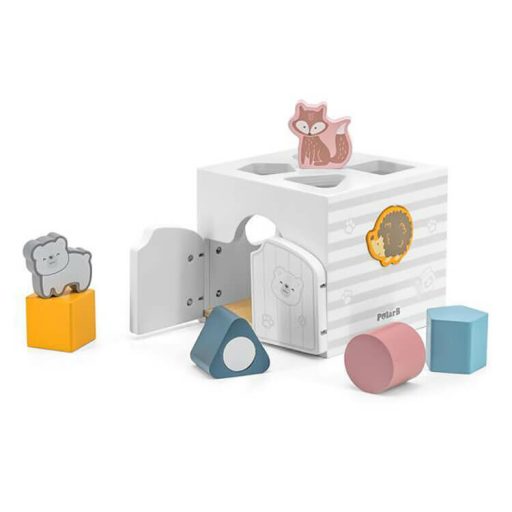 Fából készült formabedobó állatokkal és geometriai elemekkel. Szórakoztatja és hosszú időre leköti a gyermekeket, emellett fejleszti is őket. Rázogatásra a formák zörögnek, amely még érdekesebbé teszi a vele töltött időt. A játék során fejlődik a gyermekek finommotoros készsége, szem-kéz koordinációja és térlátása. Segít még a színek, formák és állatok elnevezésének megismerésében és gyakorlásában játékos módon.