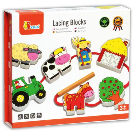 A doboz tartalma 7 darab fából készült színes figura és fűzőzsineg fa botocskával a végén, hogy könnyebb legyen vele a munka és még több a szórakozás. Óvodás kortól ajánljuk lányoknak fiúknak egyaránt. A játék során a gyermek könnyedén elsajátíthatja a a farmon található állatok, növények és járművek nevét, a színeket és még számolásra is ösztönzi őket. Mindezek mellett fejleszti a finommotoros készséget is.