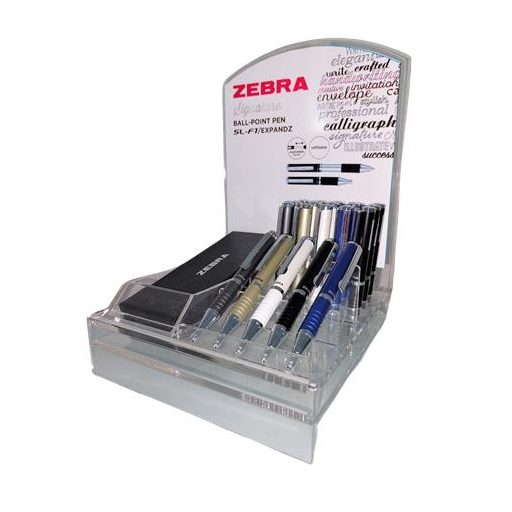-a display tartalma: 4-4 db szürke, fekete, fehér, pezsgő és sötétkék színű SL-F1 golyóstoll díszdobozzal