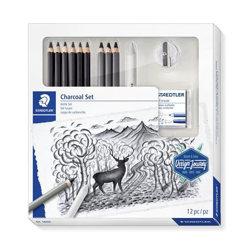 Készlet tartalma: 6 grafitceruza és 3 szénceruza különböző keménységekben, 1 papírceruza, 1 gyurmaradír és 1 kétlyukú hegyező