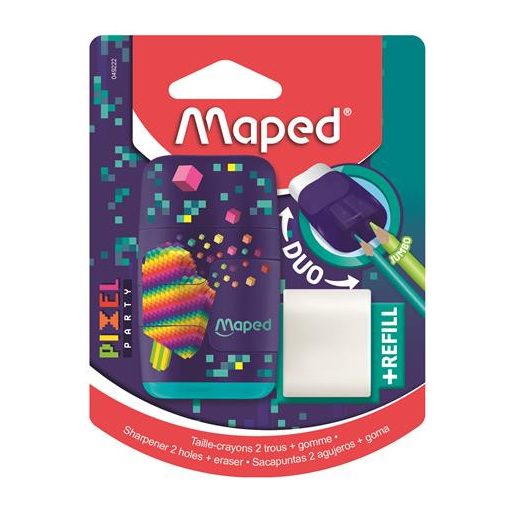 Hegyező és radír, kétlyukú, tartályos, pótradírral, MAPED "Pixel Party Connect"