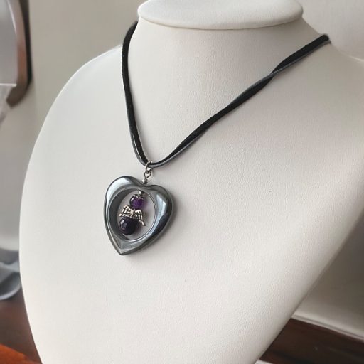 A hematit szív mérete 3,4cm magas, az ametiszt angyalka 6 és 8mm-es ásványból készült.