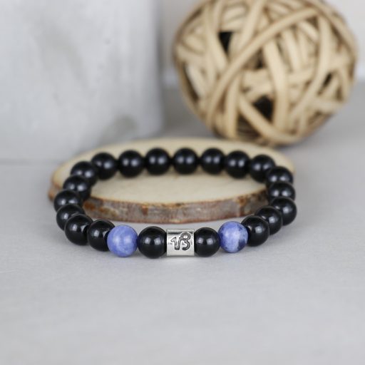 Ónix és szodalit 8 mm-es ásványból készült karkötő, a horoszkóphoz tartozó fém jeles köztessel.