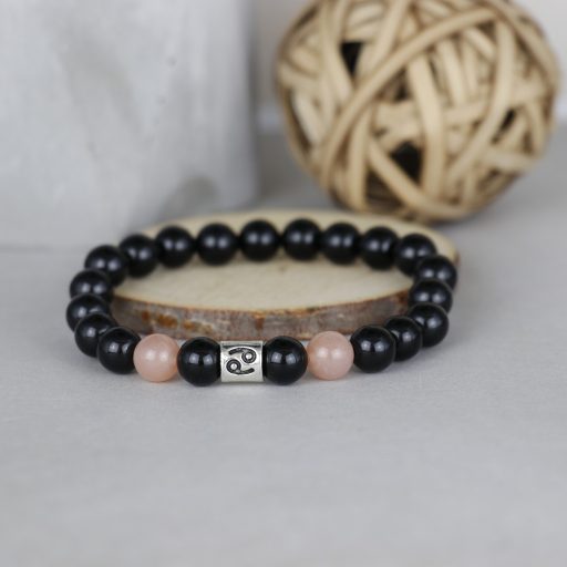 Ónix és holdkő 8 mm-es ásványból készült karkötő, a horoszkóphoz tartozó fém jeles köztessel.
