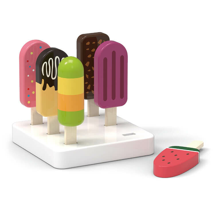 Jégkrémek állványon fából. Kiválóan alkalmas szerepjátékokhoz, mely segítségével fejlődik a képzelőerő, a nyelvi- és kapcsolatteremtő képesség. Fagyi