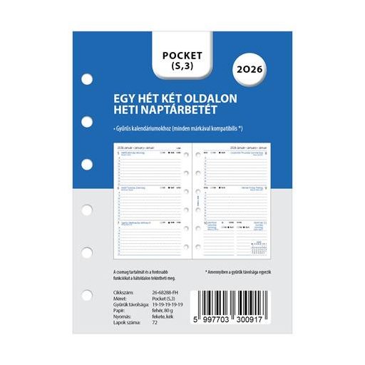 Kalendárium betét, tervező, Filofaxhoz, pocket méret, heti, 1 hét/2 oldal, 2026